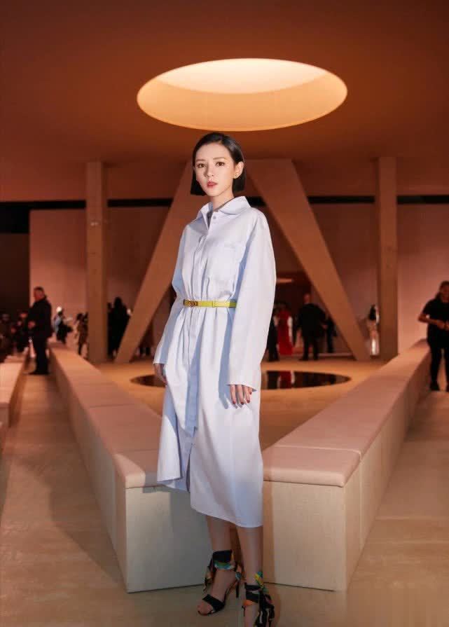 一条淡蓝色的衬衫裙搭配高跟鞋,简约风十足,而且也显得气质很优雅,展现出她温柔的一面,和平时的私服穿搭是不一样的效果。