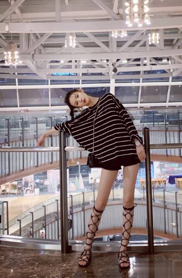 不得不说,当她穿上这款鞋子看到她的大长腿时,不禁想问,这不就是竹竿吗?真的是又细又长,而且又很直,应该是很多女生都喜欢的腿型吧?而且这一身穿搭也比较简单时髦,条纹T恤搭配短裤,在春秋季节也是很常见的,可以很好秀出自己的身材。